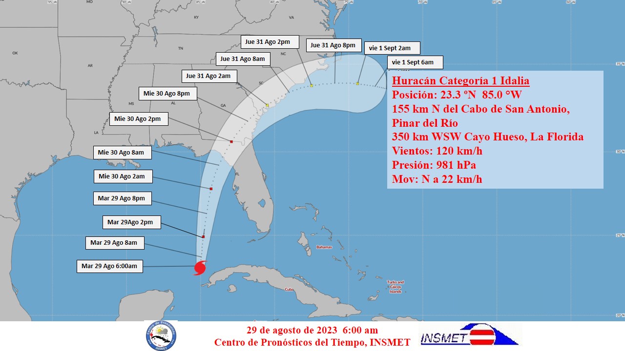 En las próximas 12 a 24 horas Idalia continuará con similar rumbo, inclinando su trayectoria al norte-nordeste con un incremento en su velocidad de traslación y pudiendo convertirse en un huracán de gran intensidad antes de tocar tierra por el norte de La Florida.